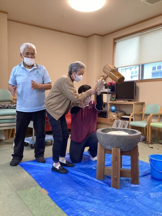 毎年恒例、お餅つきを行いました! 職員が手伝い利用者様と一緒に行いました。